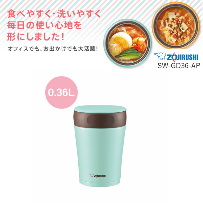 象印 ( ZOJIRUSHI ) ステンレスフードジャー 360ml チョコミント SW-GD36-AP SW-GD36 360ml カラーバリエーション パンプキン(DP) ベリー(PP) チョコミント(AP) 商品名 象印 ( ZOJIRUSHI ) ステンレスフードジャー 360ml チョコミント SW-GD36-AP 品番 SW-GD36-AP カラー チョコミント 商品概要 ・高い保温・保冷力でドリンクの温度を長時間キープし、一日中美味しくお飲みいただけます。 ・はずせて洗える「樹脂製飲み口」採用でやさしい口あたり ・カンタンに分解できるせんセットだから、すみずみまできれいに洗える。 ・※発売時期により商品の在庫がない場合はございます。予めご了承ください。 容量(L) 0.36L 保温効力(6時間) 57℃以上 保冷効力(6時間) 10℃以下 幅×奥行×高さ(約cm) 9.5×9.5×13.5 口径(約cm) 8 重量(約kg) 0.28Kg 注意事項 ・なるべく実物に近い色を画像で表現していますが、撮影環境・お使いのディスプレイなどの条件によって多少の誤差が生じる場合がございます。・ ご注文タイミングやご注文内容によっては、購入履歴からのご注文キャンセル、修正を受け付けることができない場合がございます。